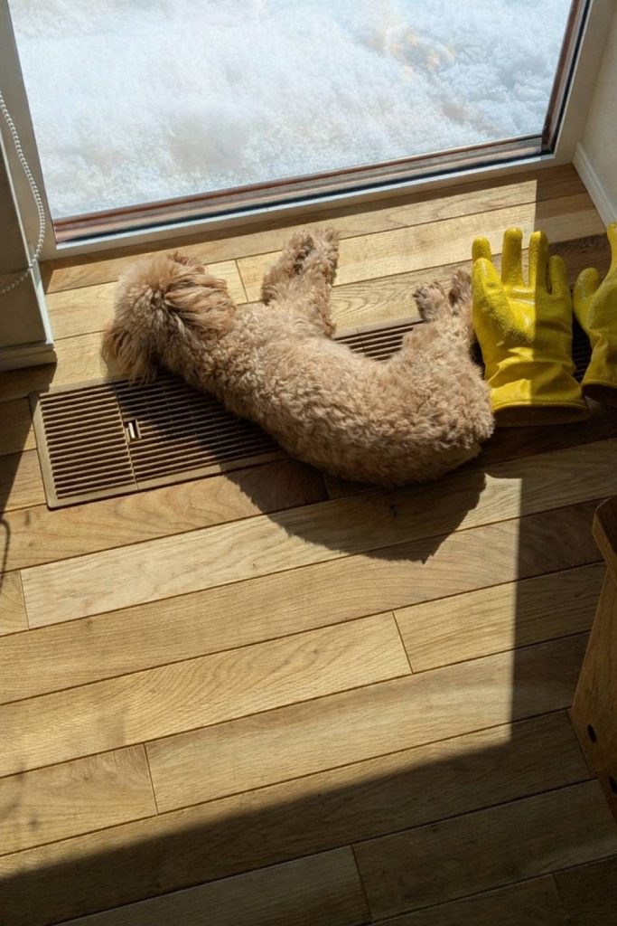 お施主様コメント:日向ぼっこをしているチロルと除雪して濡れた手袋を乾かしている生活感が日常を表現しているような気がします。